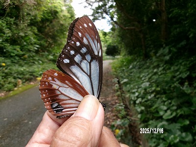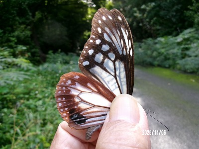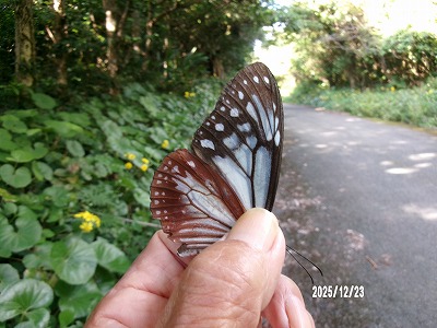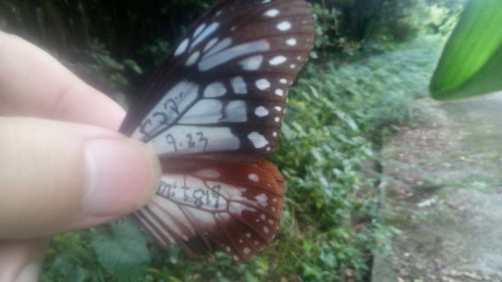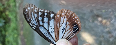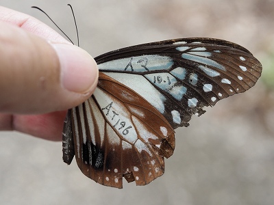 5月30日 滝川林道でマーキングした標識 : キカイ MF804 5/30 T は6月9日 宮崎県阿波岐原町前原で シマフジバカマに訪花、吸蜜しているところを 後藤泰樹さんによって再捕獲されました。この日は一日中雨とのこと