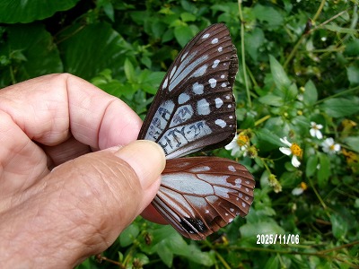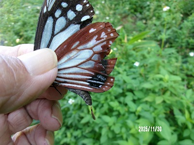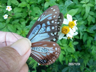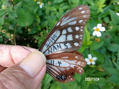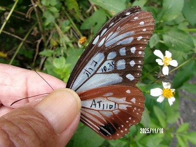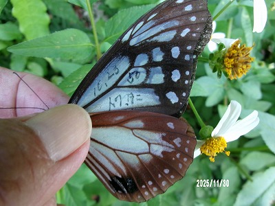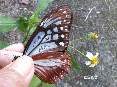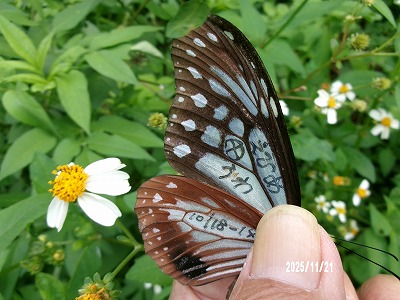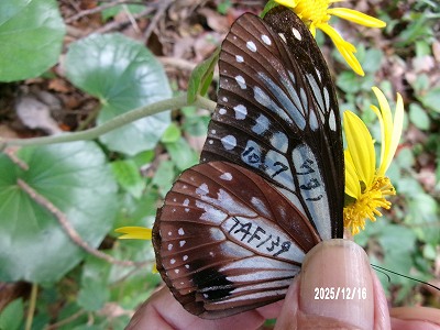 この個体は 土田 章雄 さんが10月30日 13時30分頃 高知県幡多郡大月町鉾土でヒヨドリバナ訪花をマーキングされたものです。