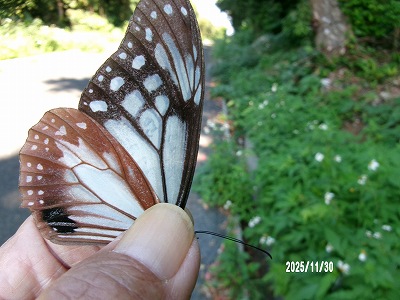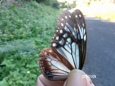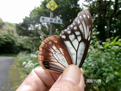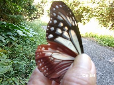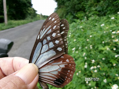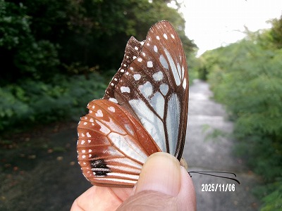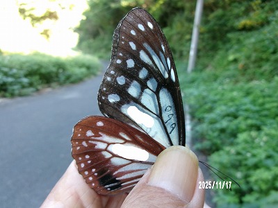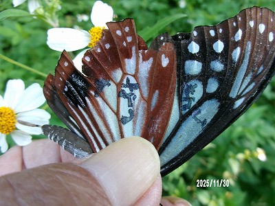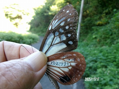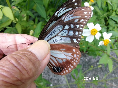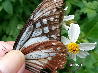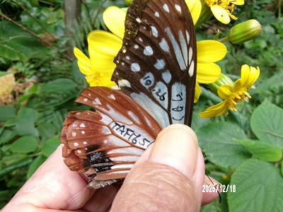 この個体は 三好健二 さんが10月18日 15時28分 愛媛県西予市宇和町野田起点林道龍王成谷線で サワヒヨドリの花吸蜜中を捕獲マーキングされたものです。