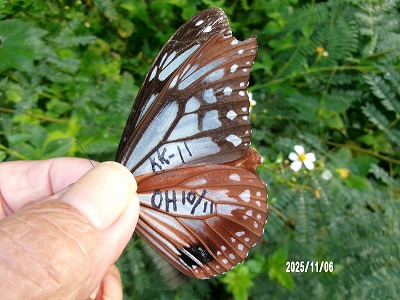 この個体は 小松 清弘 さんが 10月11日 京都市左京区大原勝林町 で植栽コバノフジバカマに飛来をマーキングされたものです。
