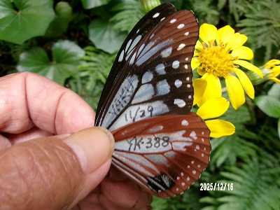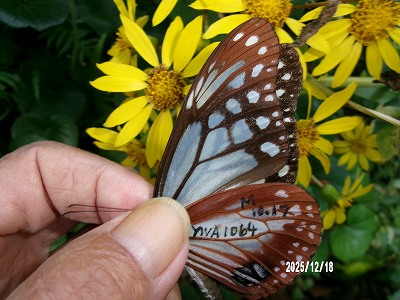 この個体は 久保田 義則」さんが 11月29日 10時20分 鹿児島県熊毛郡屋久町原 神山小付近でヤマヒヨドリで吸蜜中をマーキングされたものです。